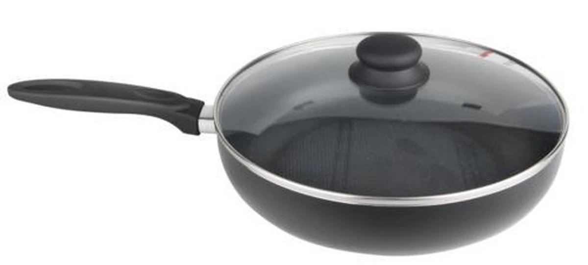 Topkwaliteit. Brabantia Hapjespan met glazen deksel, en 1 handvatsteel. afmeting: Ø 28 cm.