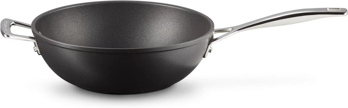 Le Creuset Wokpan Les Forgées TNS ø 26 cmDeze Le Creuset Wokpan Les Forgées is met zijn diepe gebogen randen en klassieke vorm ideaal voor het bereiden van noedelgerechten, curry’s en nog veel meer. De wokpan heeft een diameter van 26 centimeter en is gemaakt van aluminium. Het hard geanodiseerd gesmeed aluminium creëert een efficiënte warmtegeleiding en – verdeling om gelijkmatig te kunnen koken. Door de beste antiaanbaklaag ooit is hij eenvoudig in gebruik, makkelijk schoon te maken en bestand tegen metalen keukengerei. Dankzij de RVS hulpgreep kun je hem gemakkelijk verplaatsen.