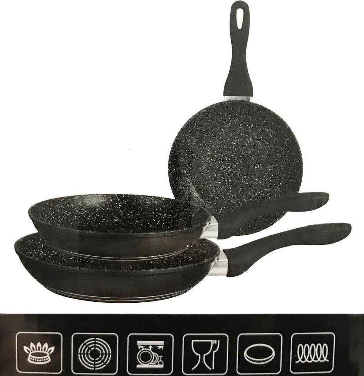 Koekenpannenset in nature-look. Afmetingen: 20 cm, 24 cm en 28 cm. Met anti-aanbaklaag, geschikt voor olie-vetvrij koken. Geschikt voor alle warmtebronnen inclusief inductie.