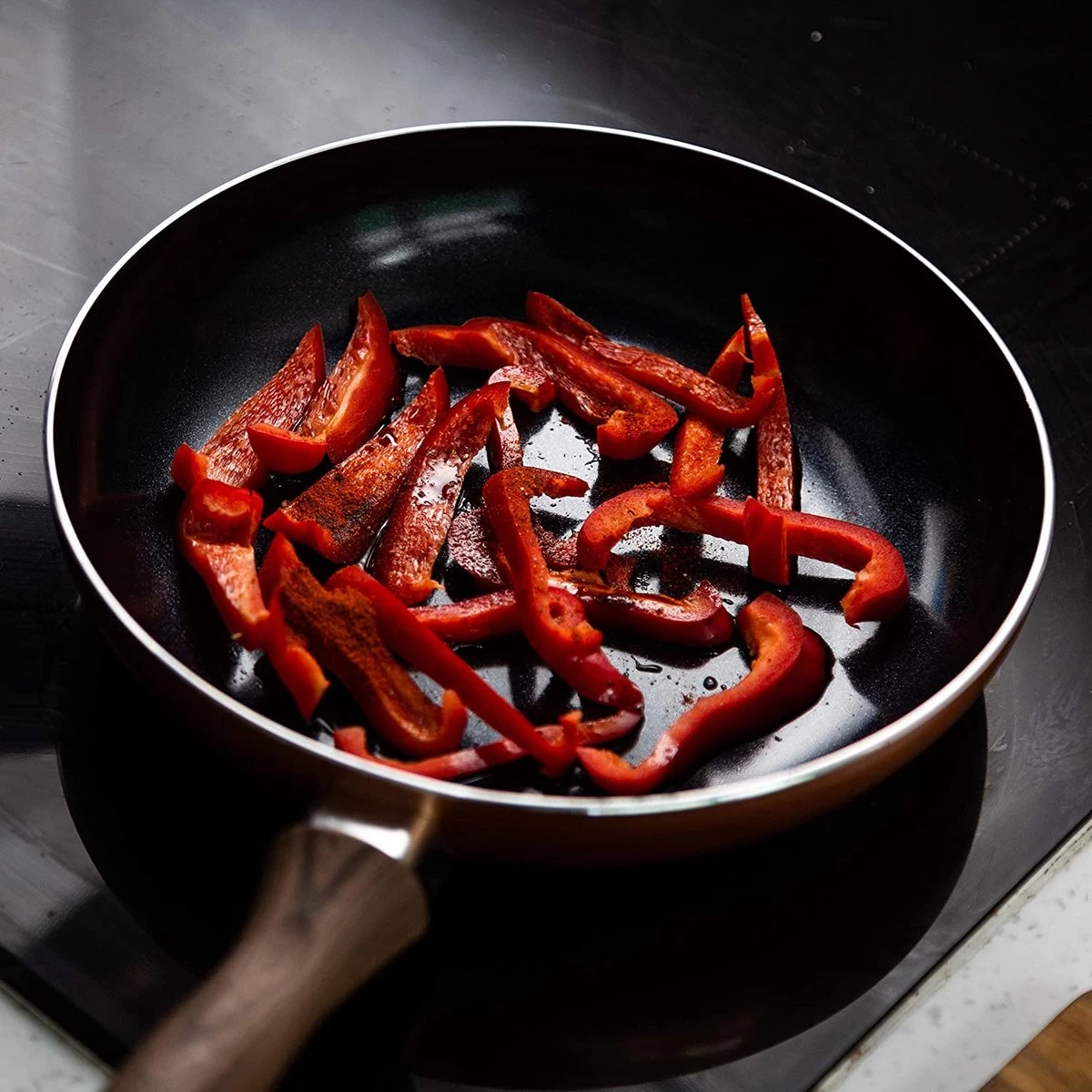 Onze koperen roerbakpan heeft een stevig, betrouwbaar ontwerp met een bakelieten handgreep die gemakkelijk te hanteren is, waardoor het gemakkelijk is om de braadpan te bedienen en brandwonden of ongewenste ongelukken te voorkomen. met zijn elegante koperkleur en keramische antiaanbaklaag aan de binnenkant zul je meteen verliefd worden op deze braadpannenset