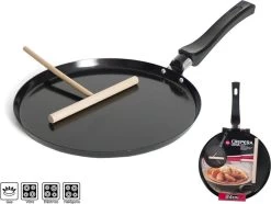 Zwarte pannenkoekenpan/crepepan 24 cm met anti-aanbak laag en houten beslag verdeler. Met de houten schraper kunt u het beslag, wat u in de pan heeft gegoten, verdelen zodat u een perfecte pannenkoek/crepe kunt bakken. In de steel zit een gat waarmee u de pan kunt ophangen, maar deze is officieel gemaakt om de pollepel/spatel welke u gebruikt er in te zetten zodat het aanrecht schoon blijft.
